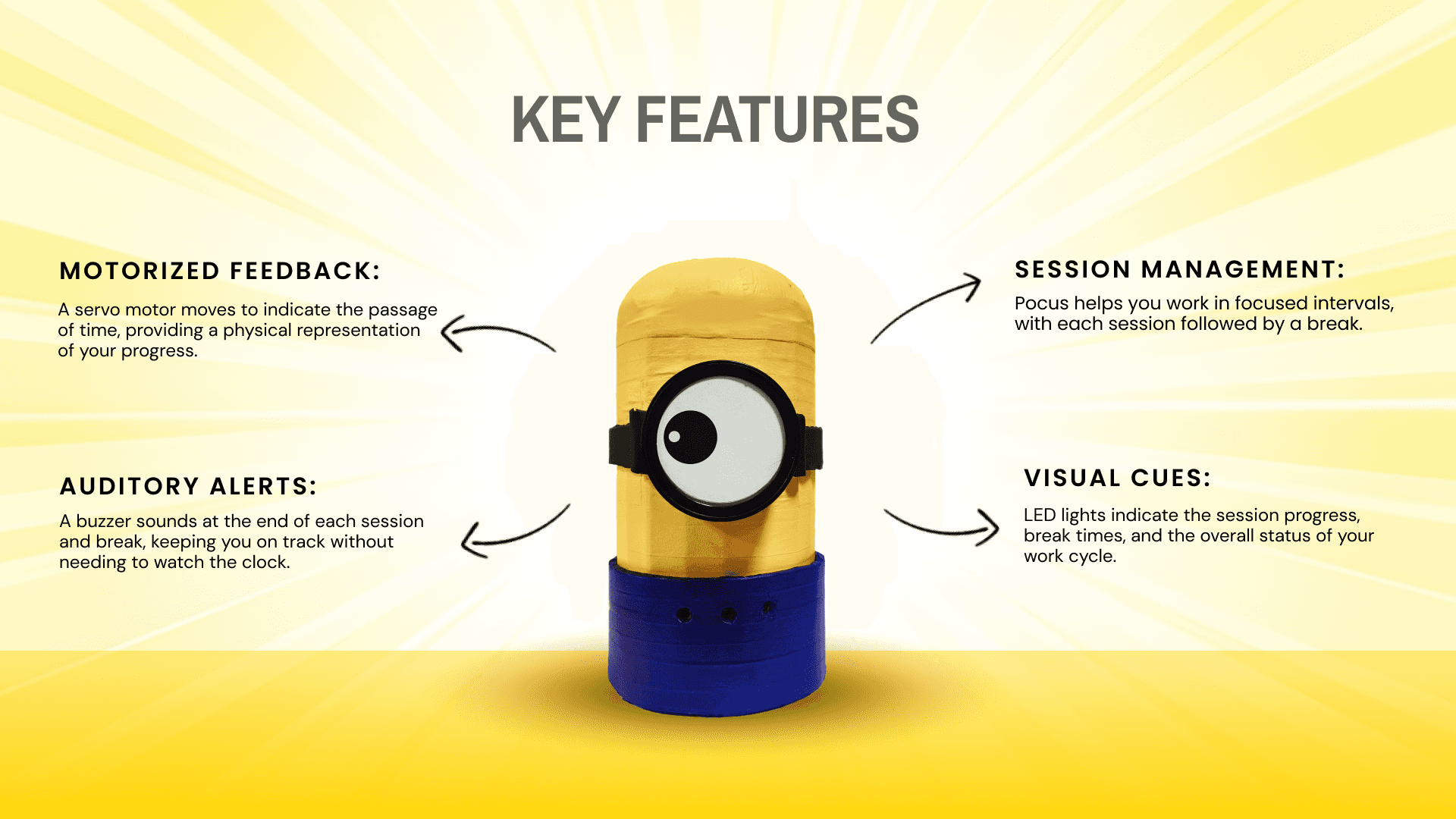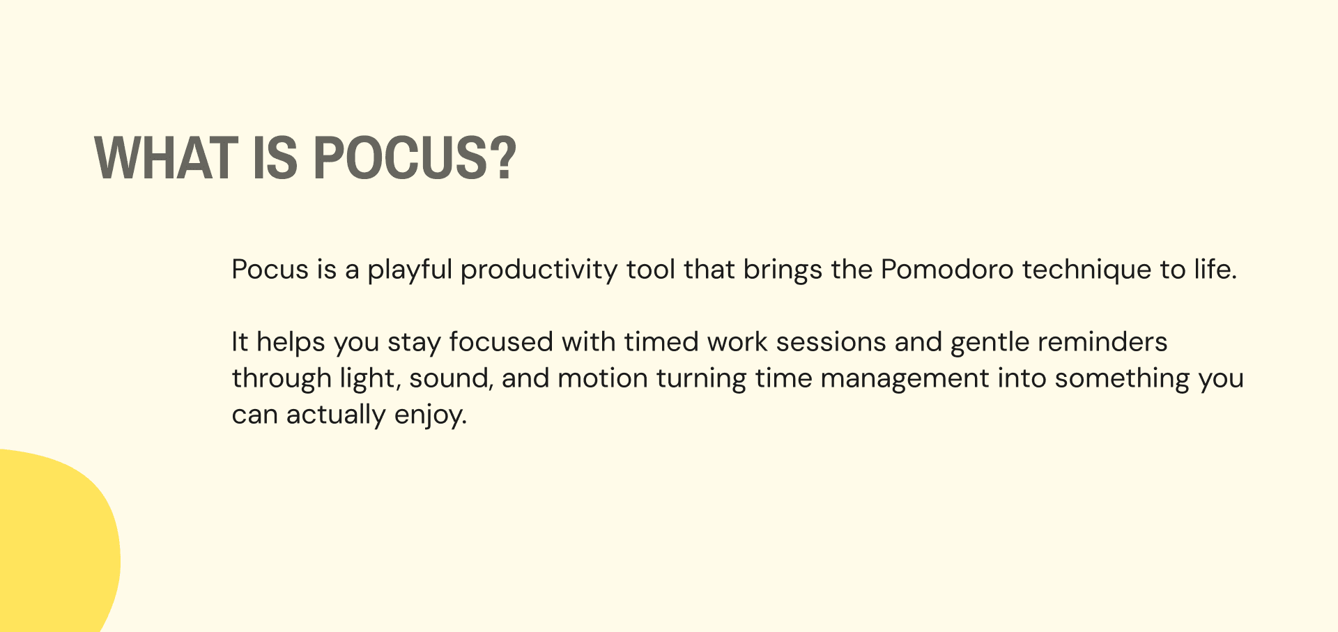 Pocus is a physical productivity companion that doesn’t buzz in your phone—it visually and tangibly guides your attention using lights, motion, and sound. It doesn’t just tell time. It tells you when to stop.
